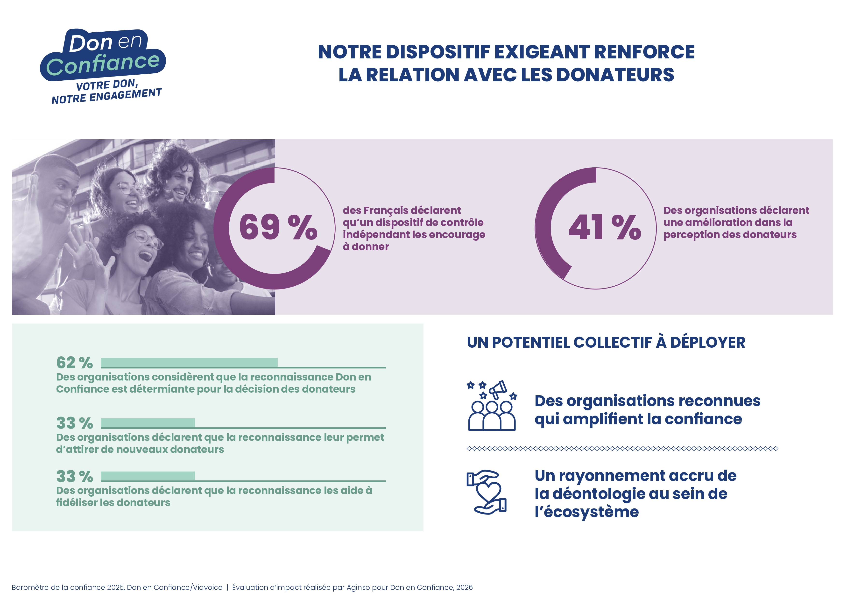 Une évaluation d’impact indépendante, menée avec le cabinet Aginso, analyse les effets de notre dispositif sur les organisations reconnues Don en COnfiance et sur la relation de confiance avec les donateurs.